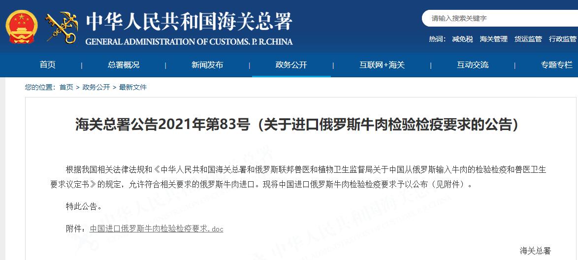 2021年10月18日,海關總署發(fā)布2021年第83號公告:允許符合相關要求的俄羅斯牛肉進口,詳情如下: