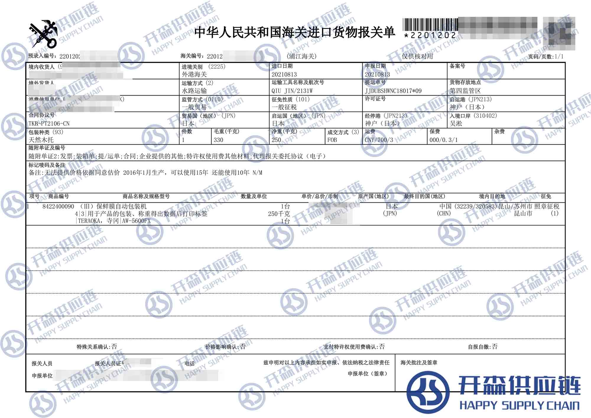 上海港日本舊保鮮膜自動包裝機(jī)進(jìn)口報關(guān)代理【進(jìn)口案例】