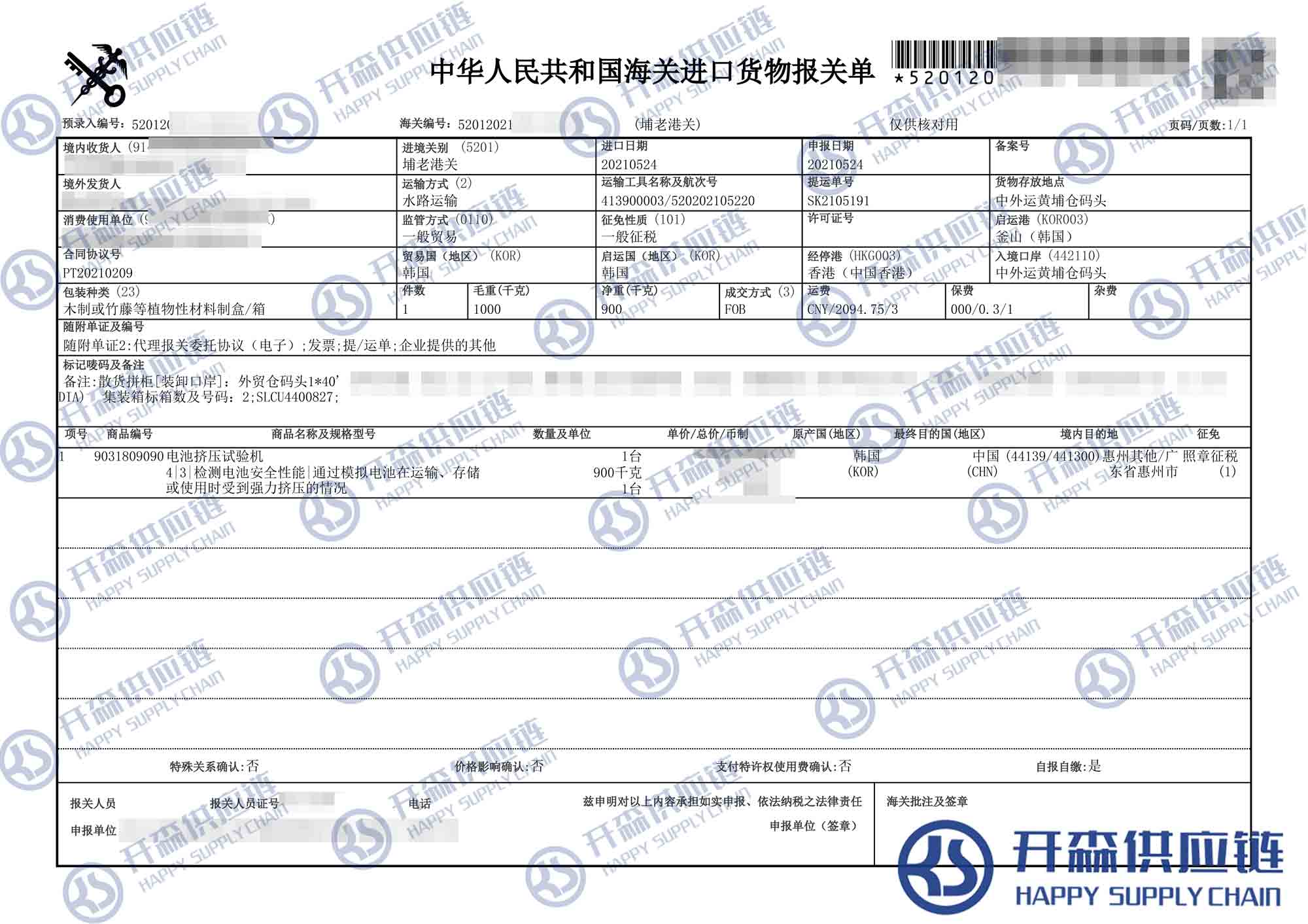 韓國電池擠壓試驗機進口報關(guān)代理服務【進口案例】