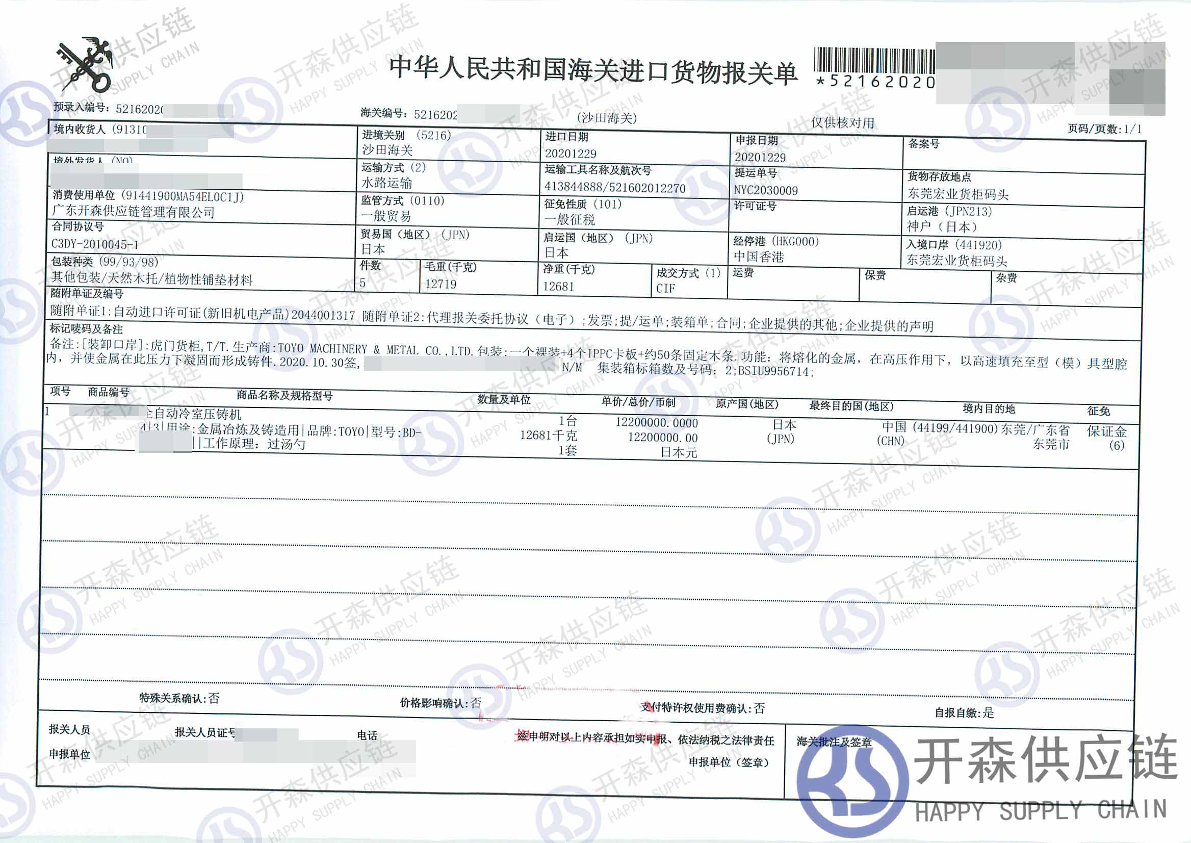從日本進口全自動壓鑄機等到東莞碼頭,我司提供門到門進口一站式清關服務,開森擁有十余年機械設備進口清關經驗及案例,為客戶提供量身制作的進口方案,讓客戶進口省時省心省成本。