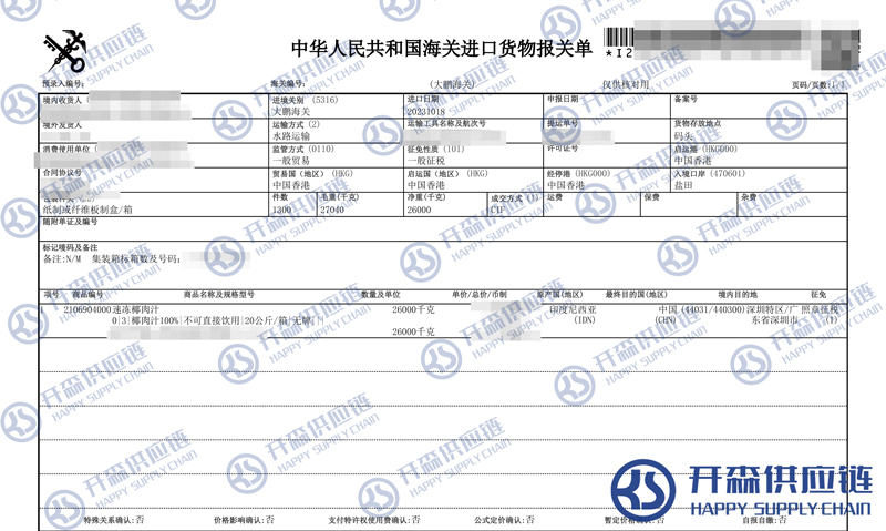 【本文結語】 上述就是深圳鹽田港椰子水進口報關代理服務【清關案例】的全部內容,希望能對您有所幫助,如有食品進口報關上任何疑問及問題可隨時在線聯系我們或撥打 18002611553,開森供應鏈擁有豐富的食品進口報關操作經驗及案例,10余年進口經驗為您所用,各類進口疑難都能為您一一解答及協助快速處理解決!